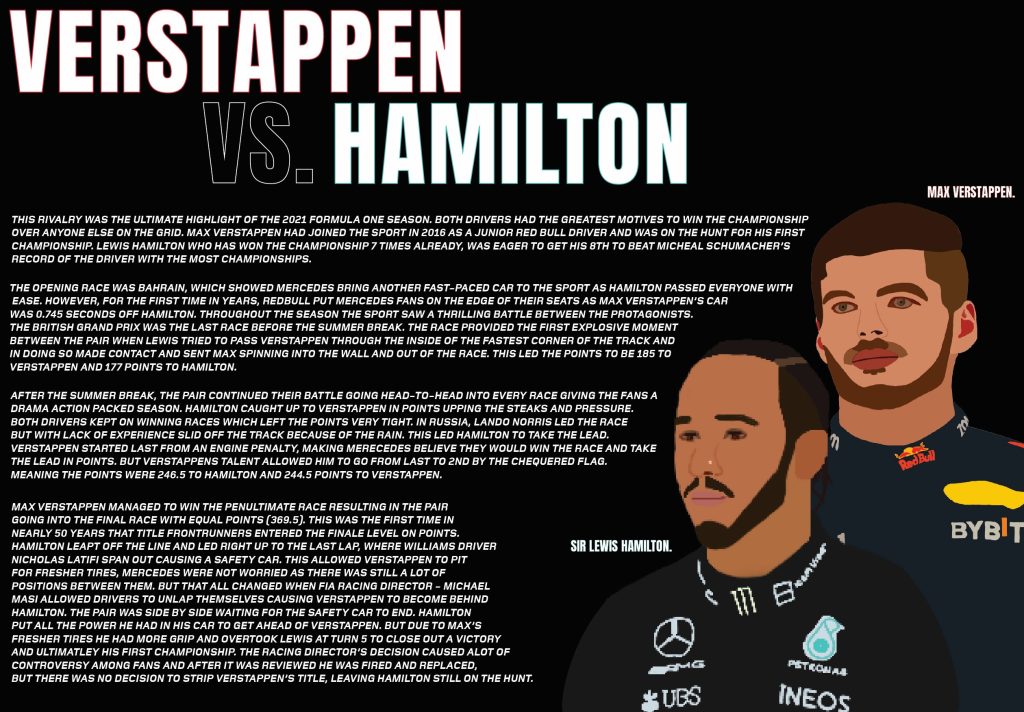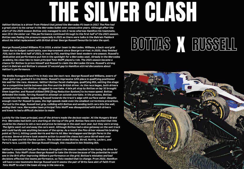 My next double page was on the rivalry between Valtteri Bottas and George Russell, on who would get the Mercedes seat. I used a picture I took of two F1 cars but edited it to look like Bottas and Russell’s cars. I did this by using the brush tool in photoshop. I wanted to make the photo look more like a drawing and more cartoony to match the portraits, so on of the neural filters was used on Photoshop to give it that unique look. I kept the text on one side because I wanted the picture to be big enough to stand out and for people to look at. I have also used the same fonts as my first pages to keep it consistent and make everything look in form. There was some dead space above the picture so to fill space I added a ‘Bottas x Russell’ to catch people’s attention and to also help identify which car is who’s. I used a white outline only, so the text doesn’t take away the attention of the main title.