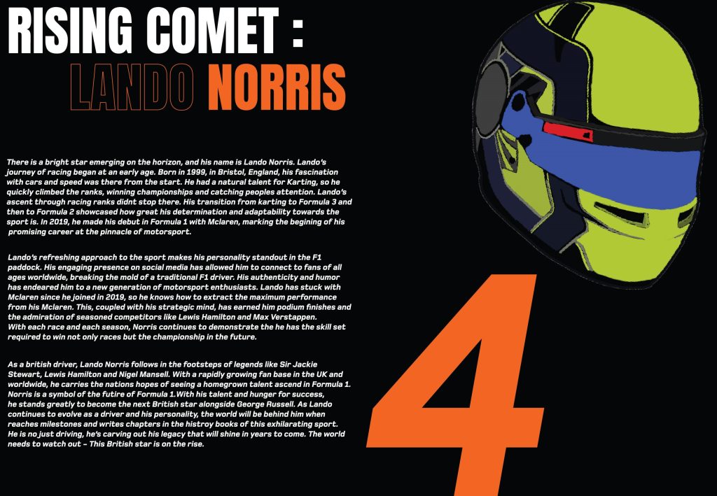 My last double page was all about the up-and-coming star Lando Norris. As this was solo driver focused, I used his team colours of McLaren. I wanted the title to pop out to people, so I made ‘Rising comet’ in plain white then used the orange to draw people in. I only outlined ‘Lando’ because when people see the colour orange and Norris together, they will know that it is Lando. On the 2nd page I presented his racing number #4 in the Foundry Monoline font because it shows this double page is all about Lando and F1 fans who know his number will be drawn in by it. I then paired that with his 2021 racing helmet that I created in Procreate. This helps readers identify who he is if they were to look him up from reading my magazine and entices people to read the information.