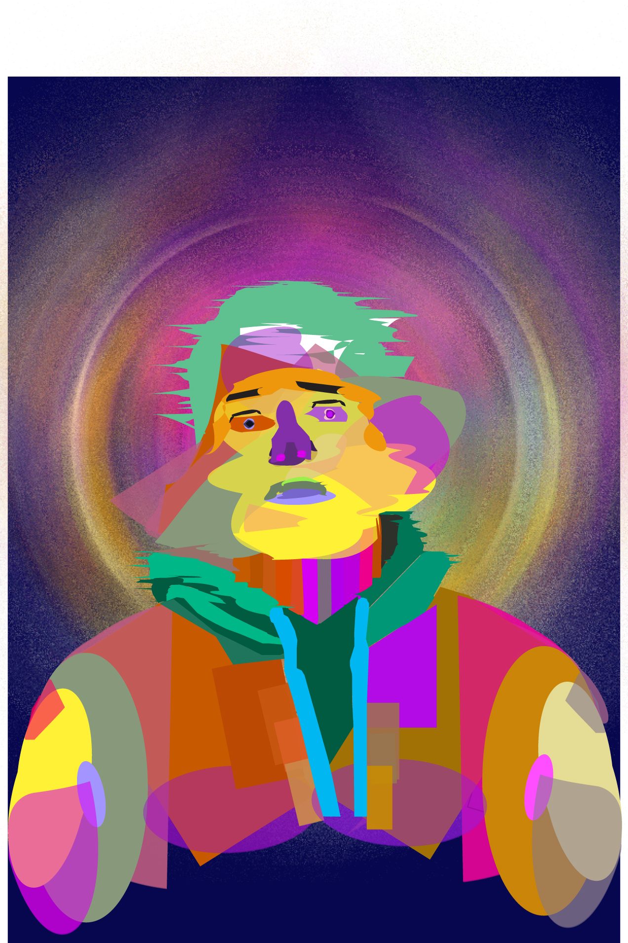 This illustrator Portrait focuses on my creative mind. A various number of different shapes and sizes were used to form my body and head shape. I used vibrant colours only because my mind is full of colour when I’m in my creative mindset, but my thinking processes makes my mind chaotic which is what the various shapes represent. I wanted to represent this chaos in a few ways throughout the portrait. I used a diffuse affect to stretch the head out to make it look like its glitching. The glitch effect works well and shows that the mind is overloading with creativeness. The background colour complimented the variety of colours but it wasn’t enough. So, I duplicated the vector portrait and used radial blur to bring a burst of colour to the background. I then added some grain to make it look like small particles, which I think worked well.