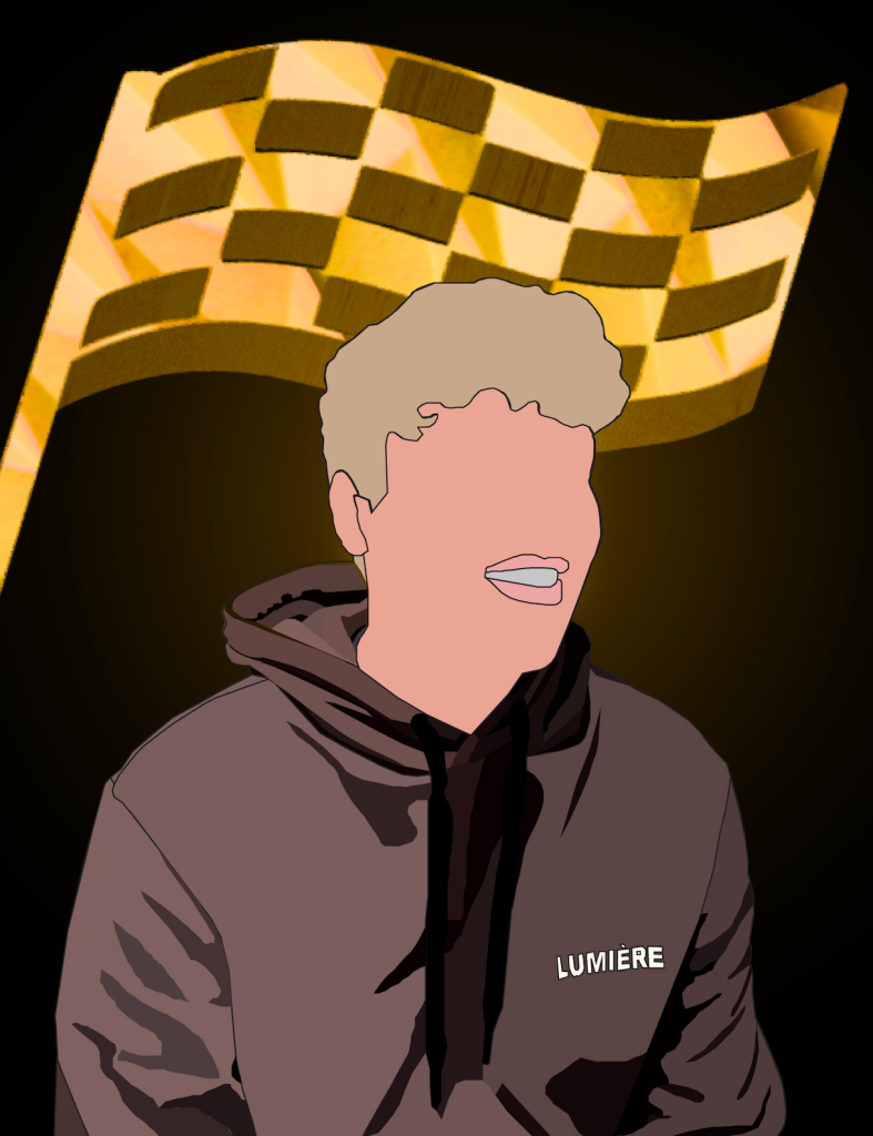 The second Illustrator Portrait focuses on my attributes and dream. I used illustrator to turn a portrait of me into vector art. I focused more on creating the different shades of the hoodie and getting my colour tones right. I didn’t go into much detail with my face because I thought I did a good enough job of the shape of my face and hair that it looks enough like me. I also didn’t want to put all the focus towards my face because I want people to look both at the flag and my portrait not one over the other. I created the chequered flag but I wanted to make it 3D so it stood out more. I used the 3D materials tool to also give it the gold material texture. The flag represents my attributes of being hard working and being a winner as I’m very competitive.