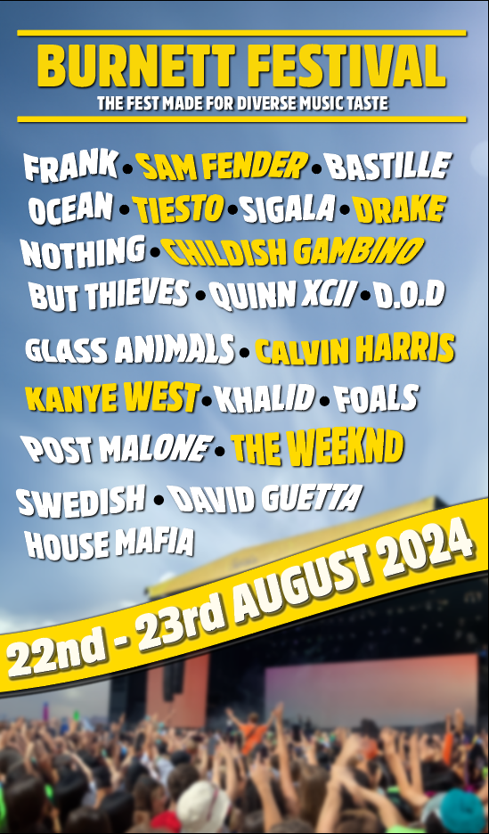My First Self-promotional Poster was all about my music taste and the artists I listen to the most. The poster shows what a festival would be like if all my artists I listened to attended. I called it the Burnett Festival after my last name because its unique to me as I listen to all these artists. I used a photo that I took when I went to a festival in August, but I extended the sky so I could have lots of room to put the artists names. The bright vibrant yellow worked well against the colour of the sky and made the headliners pop out. The rest of the acts were in white with a drop shadow to make them clearer. I used the flag warp tool and adjusted each artist’s name individually to give them their own unique look, giving the poster a bit of character.