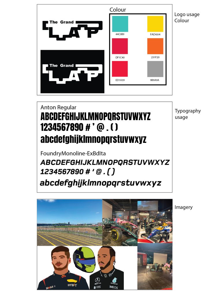 Typographical Graphic Standards are important to be presented to a client etc because they show how things can be used and how they can’t. I wanted my typographical graphics standards page to be minimalistic because that will be seen throughout my project. I created 3 main boxes and added crucial information only to keep the minimalistic look but to also not overwhelm the boxes. 6 colours were only needed because a lot of the time the contrast of black and white will be used. I decided to mostly pick vibrant colours because it helps the text stand out more to the reader and helps the reader interact with the magazine more. Below the colours I added the hex codes so people who view my work or who like the colours I use can see where they originate from. I have placed 2 ways my logo can be presented correctly, and any other way would not meet the graphical standard. The logo uses Arial black for the smaller text and the Alfarn font for the Lap. I felt that it was appropriate to present the typography I will use throughout my work so people can not only see what the font looks like with upper case and lower case but also can know the name of the font and research it if they wanted. I chose Anton regular because the kerning is very closed, and the characters are lean but tall giving the text a dramatic sporty look which I thought would be great for a Formula 1 magazine. The Foundry Monoline font was chosen specifically for the sub text and for paragraphs of information. The font’s italics are great for smaller texts because it gives the text motion which not only makes the reader think that they are reading much faster, but it also contributes nicely to Formula 1 as the sport is all about motion and fast paced movement. I also thought it would be important to include the Imagery that I will be using throughout my magazine. Most will be pictures that I have taken myself from when I visited the Silverstone Museum last year. The picture of the track will most likely be used for a cover design along with some pictures of the cars. I do want to incorporate some pictures into my editorial pages, and I may edit some using photoshop to create unique pieces. I did create portraits of drivers and a helmet, using Procreate on my iPad. These will be used on their appropriate pages to catch people’s attention and to give and insight on what the drivers look like.