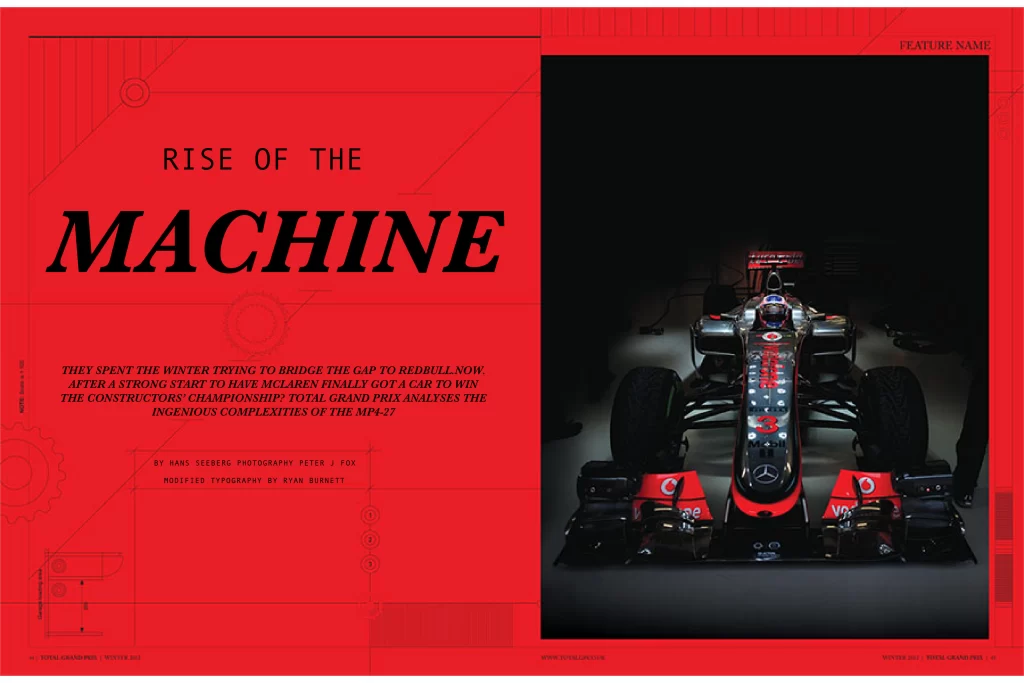 Moving onto my adaptation of the page. The font has changed for ‘Rise of the’ to the serif font Andale Mono. I think it makes the text look a lot sharper and minimalistic, and the large letter spacing makes the text stand out more, without being too big. ‘Machine’ has been kept in a serif font because although the Farnham font made it look a bit too vintage, I liked how the serifs combined with the italics established a flow of motion that compliments f1 nicely. This is why the Baskerville font has been used to replace this, in bold and in italics. This serif font has been stretched using open kerning to make it louder and more noticeable making it complement the sport more, due to Formula 1 also being a loud and eye-catching event. Originally the sub writing below the title was a serif font called Austin, the same font used in the subtitle. This was changed in the adaptation to the Farnham font with the use of italics and bold lettering. I think the bold italics have a great impact on the sub writing, as it brings in the flow of motion whilst making the text look more full of life with the bold lettering.