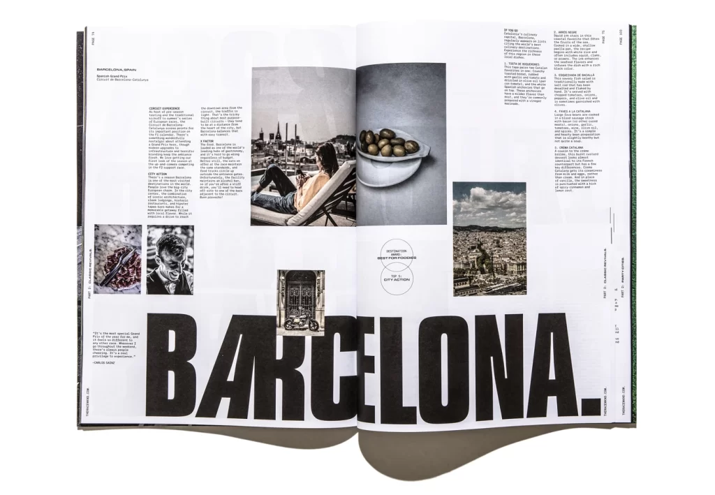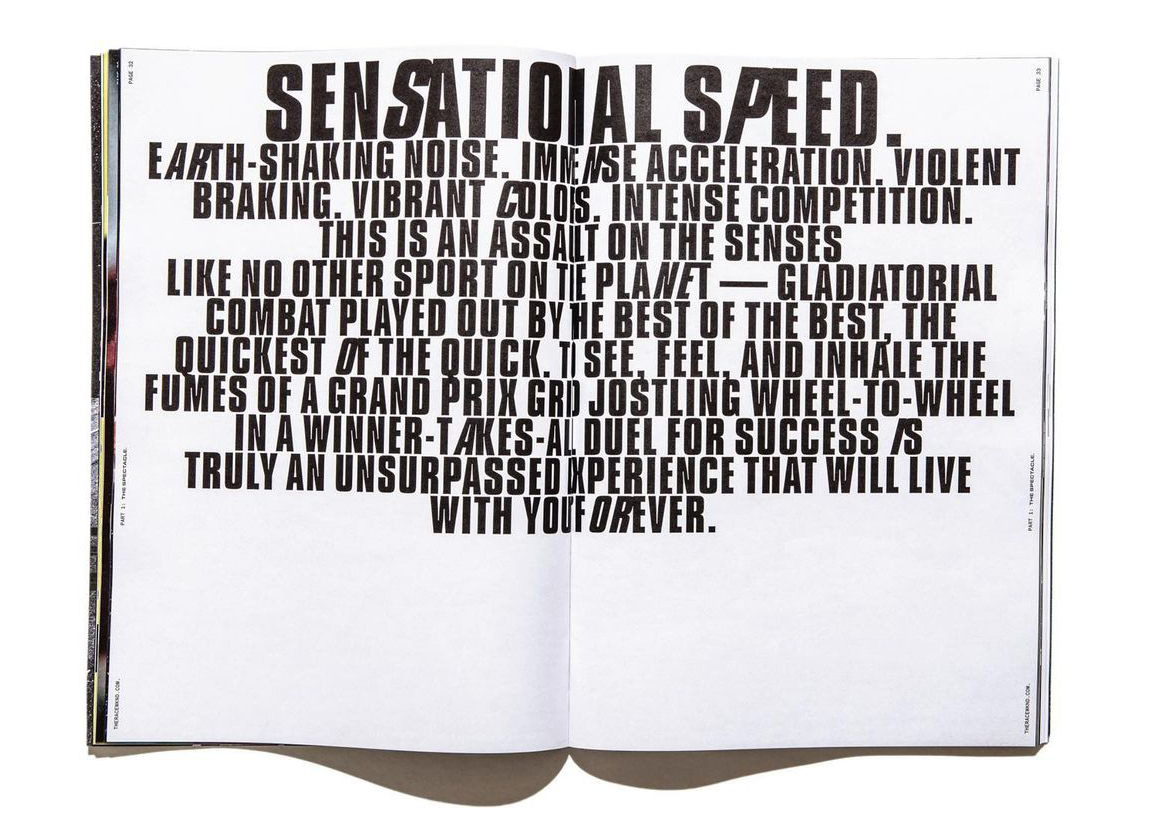 This Issue of the magazine ‘RACEWKND’ uses the typeface ‘Compacta’ throughout the pages. Formula 1 is a serious motorsport that only the best drivers in the world compete, which takes great precision and the skill to be fearless. This sans serif font represents the Formula 1 magazine well because of its bold and heavy body making its presence known by being stretched across the pages in great size, showing it has no fear in taking the spotlight of grabbing the viewers attention. The magazine makes great use out of this throughout. For example on one page, it talks about Barcelona. ‘Barcelona’ is presented across the full page with the use of large text size and kerning. What I find unique is that the ‘A’ is the only letter that is in italics. Matt Ellis (2022) states that italics are mainly used to draw attention to certain words or passages. The Italics give the type a sense of motion that makes the reader read those parts faster. It also can be a reference to ‘F1’ due to the immense speeds and motion involved in the motorsport. This theme of motion with italics is seen elsewhere. For example one page in the magazine has typography on its own. It has a title ‘Sensational Speed’ in great bold ‘Compacta’ lettering, with the ‘s’ and the ‘p’ in italics only, just like we have seen on previous pages. Using a theme in typography is great because it can be the forefront of the works identity, which helps viewers recognize your work easier. ‘Compacta’ is used below in a smaller size is used for a verse on what the motorsport involves, following the theme with the italics. The smaller text has been kerned to be more compact than the title but is spread far out across the page. This is to enable the reader to read this verse faster whilst taking pauses for affect using the full stops.