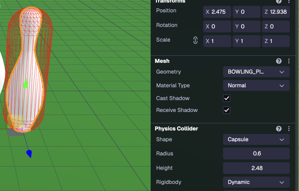 On the technical side, I modelled the target objects (bowling pins) in Blender and exported them as .glb files into 8th Wall. Setting up the physics interactions was by far the most challenging part. Initially, the pins simply fell through the floor because the system couldn’t detect their collision boundaries. After some troubleshooting, I fixed this by applying a capsule collider, which allowed the virtual ball and pins to interact realistically. This problem-solving process gave me a much better understanding of how physics simulation works in AR environments and specifically 8th wall.