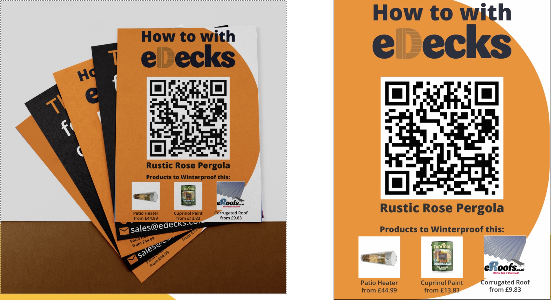 The how to leaflet series focuses on specific builds (e.g., Rustic Rose Pergola), enhanced by bold colours, minimal text, and prominent QR codes. These were influenced by James E Smith’s clean and product-focused marketing materials, which emphasize clarity over complexity. Where B&Q and Wickes often clutter print designs with multiple offers and excessive product data, we aimed for minimalist design, clean typography, and quick mobile access via QR codes.