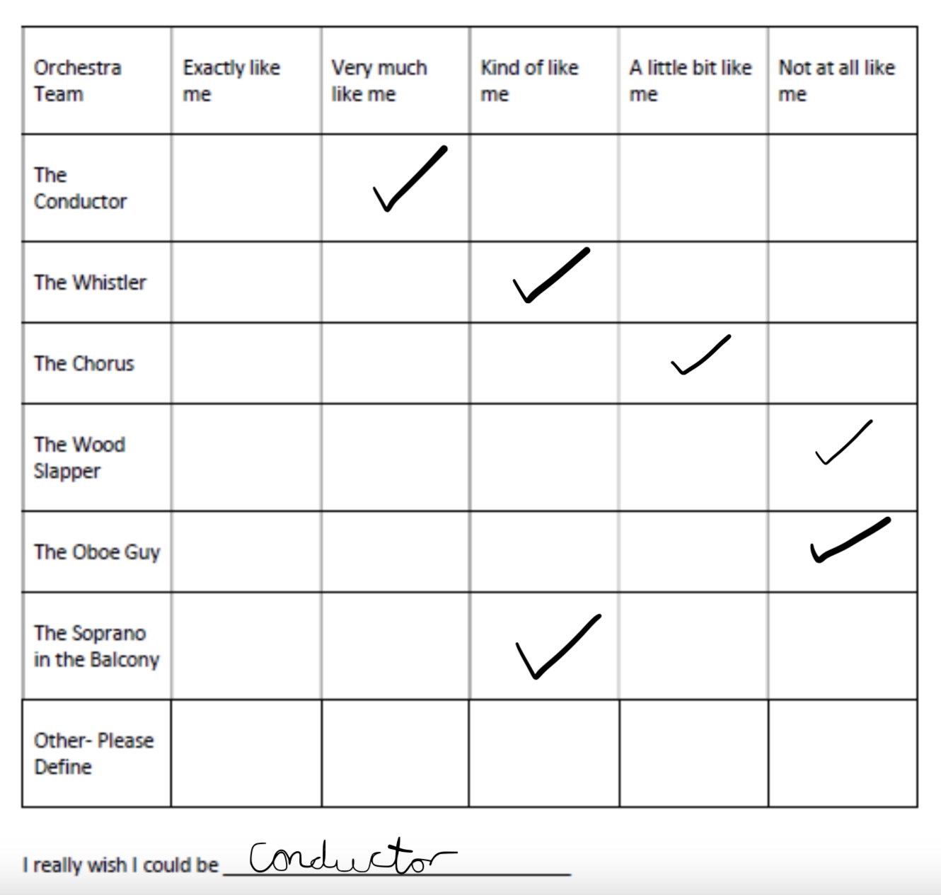Filling out the psychometric test results I came to the conclusion that the conductor was the most fitted for me. This is because a conductor has strong leadership skills, effective in communication and can adapt in situations. I’m known to do all these things whilst I work as I manage a team through stressful situations and find ways to adapt and overcome elements when needed.