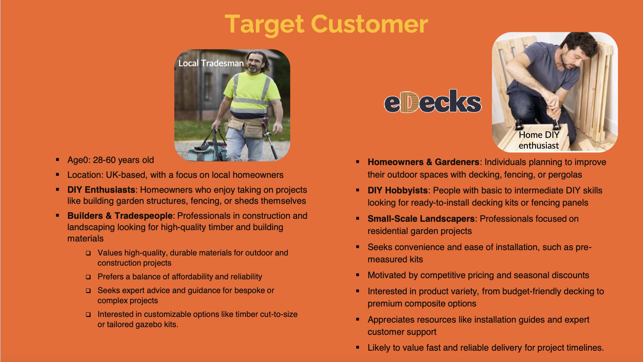 The target audience identified by the marketing team includes UK homeowners aged 28 to 60, many of whom are invested in maintaining or improving their outdoor spaces. Within this broader group, three key customer groups were identified:
